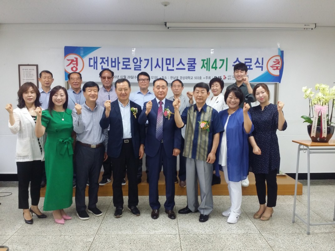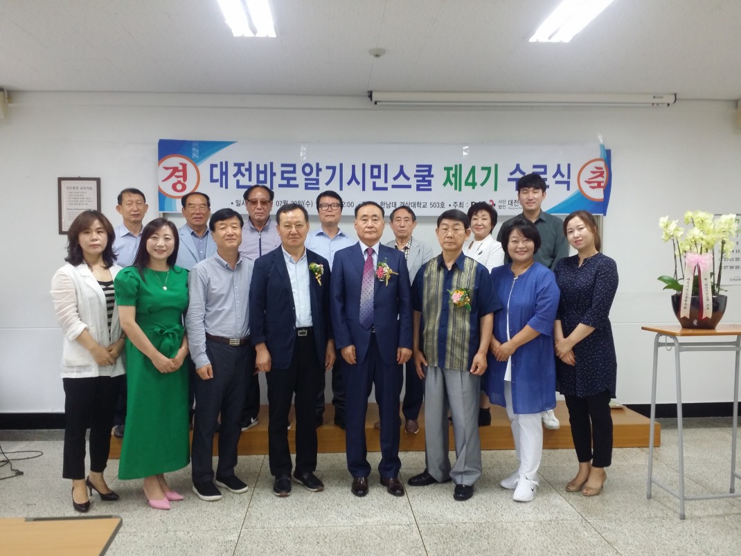 대전바로알기 시민스쿨4기수료식 페이지 정보 작성자 관리자 댓글 0건 조회 3,548회 작성일 20-09-18 00:31 본문 2020년 7월29일 11시 한남대경상대 503호 강의실에서 대전바로알기 시민스쿨4기 수료식이 거행되었다.코로나19로 인한 어려움속에서도 대전바로알기4기 수강생들은 어떤 기수보다 더 성실하고열심히 코로나19 안전수칙을 지키면서 강의를 듣고 현장답사에 참여하였다.이날 총수료자는 17명으로 공로상, 개근상, 수료증 등 다양한 상을 수여받았다. 목록 답변 이전글대전바로알기시민스쿨 제5기 개강 20.09.24 다음글CMB명숙이의 맛집전하 대전학연구회장편 출연 20.09.18 댓글목록 댓글목록 등록된 댓글이 없습니다.