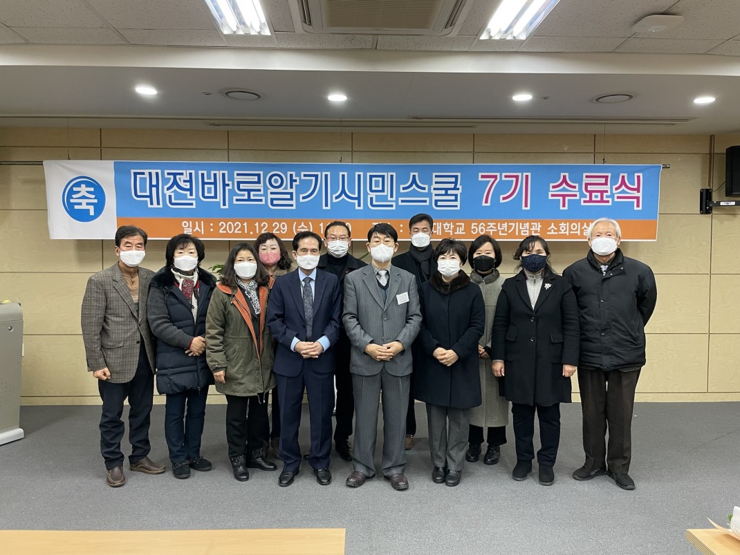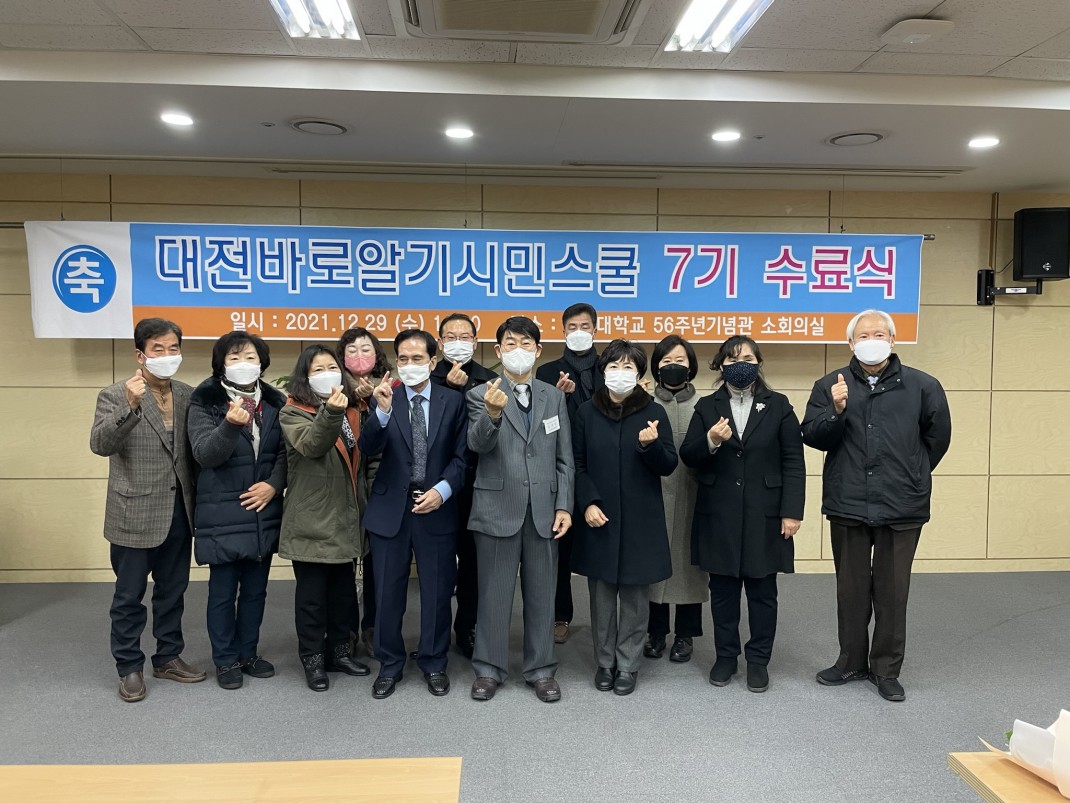 대전바로알기 시민스쿨 제7기 수료식 페이지 정보 작성자 관리자 댓글 0건 조회 3,067회 작성일 22-03-09 14:23 본문 2021년 12월 29(수) 11:00에 한남대학교 56주년 기념관 소회의실에서 대전바로알기 시민스쿨 제7기의 수료식을 하였다.대전바로알기 시민스쿨 제7기의 수료자는 총 12명으로, 수료식을 통해 수료증, 공로상, 대전학연구회 정회원 인증서, 대전시민정책개발단원 인증서 수여의 다양한 행사가 실시 되었다. 목록 답변 이전글대전시민정책개발단 출범식 22.03.09 다음글대전바로알기시민스쿨 제7기 개강식 및 입학식 21.09.08 댓글목록 댓글목록 등록된 댓글이 없습니다.
