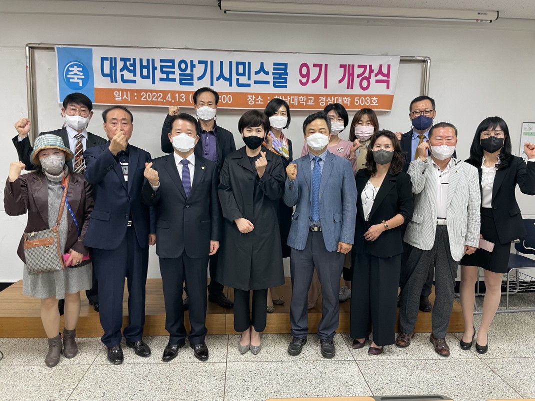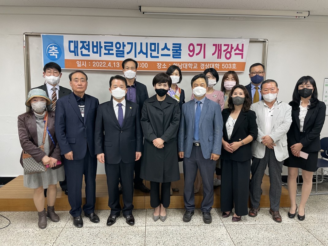 대전바로알기 시민스쿨 제9기 개강식 페이지 정보 작성자 관리자 댓글 0건 조회 3,933회 작성일 22-08-30 23:14 본문 대전바로알기 시민스쿨 제9기 입학식 및 개강식이 2022년 4월 13일 한남대학교 경상대학503호 강의실에서 거행되었다.이번 대전바로알기 시민스쿨 제9기는 수강인원이 12명으로 수강생들의 뜨거운 열의와대전바로알기 시민스쿨 선배들의 축하가 어우러져 화기애애한 분위기속에서 거행되었다. 앞으로 대전바로알기 시민스쿨의 많은 발전이 기대되고 있다. 목록 답변 이전글대전바로알기 시민스쿨 제9기 수료식 22.08.30 다음글대전바로알기 시민스쿨 제8기 수료식 22.08.30 댓글목록 댓글목록 등록된 댓글이 없습니다.