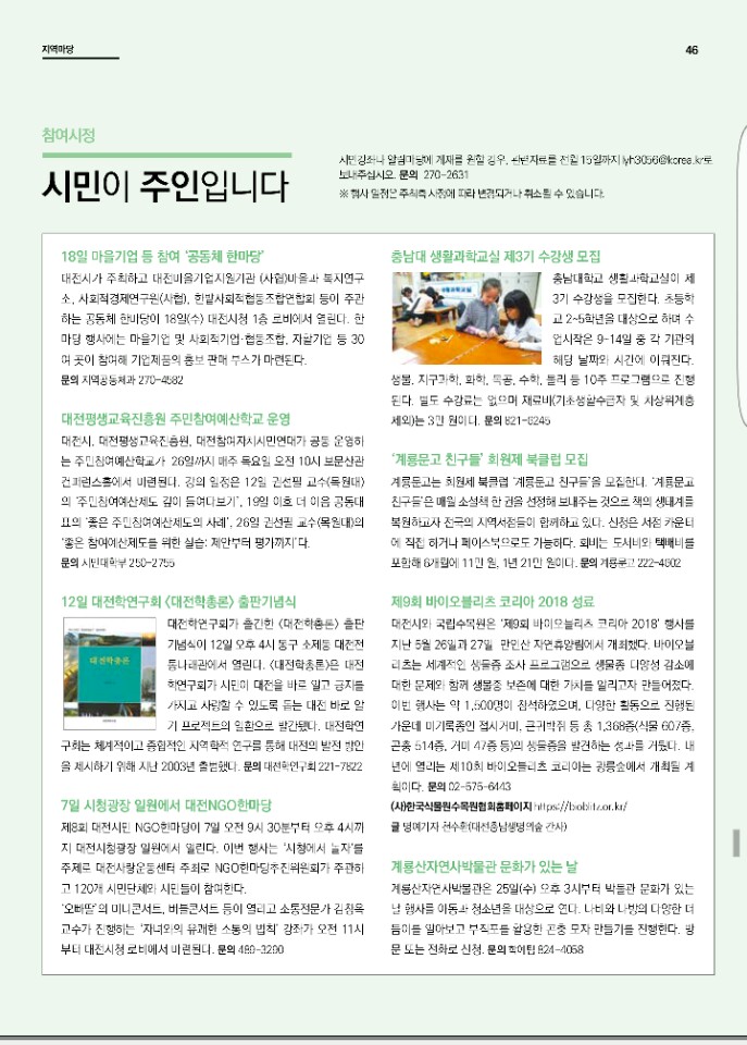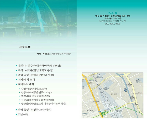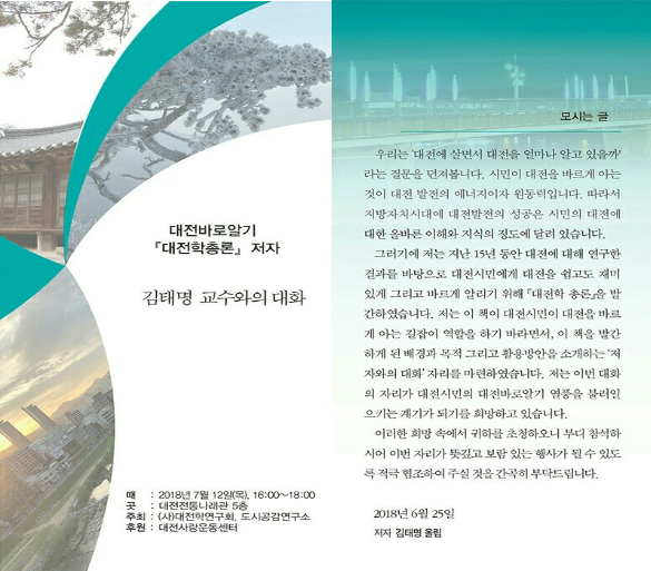 대전학총론 발간 페이지 정보 작성자 관리자 댓글 0건 조회 4,052회 작성일 18-07-07 10:05 본문 대전학총론 발간 안내입니다. 2018 년 7월 12일 16시~18시 대전전통나래관 5층 목록 답변 이전글제8회 대전시민 NGO 한마당 참석 18.07.07 다음글도시공감연구소 창립식 및 정책 大토론회 18.04.25 댓글목록 댓글목록 등록된 댓글이 없습니다.