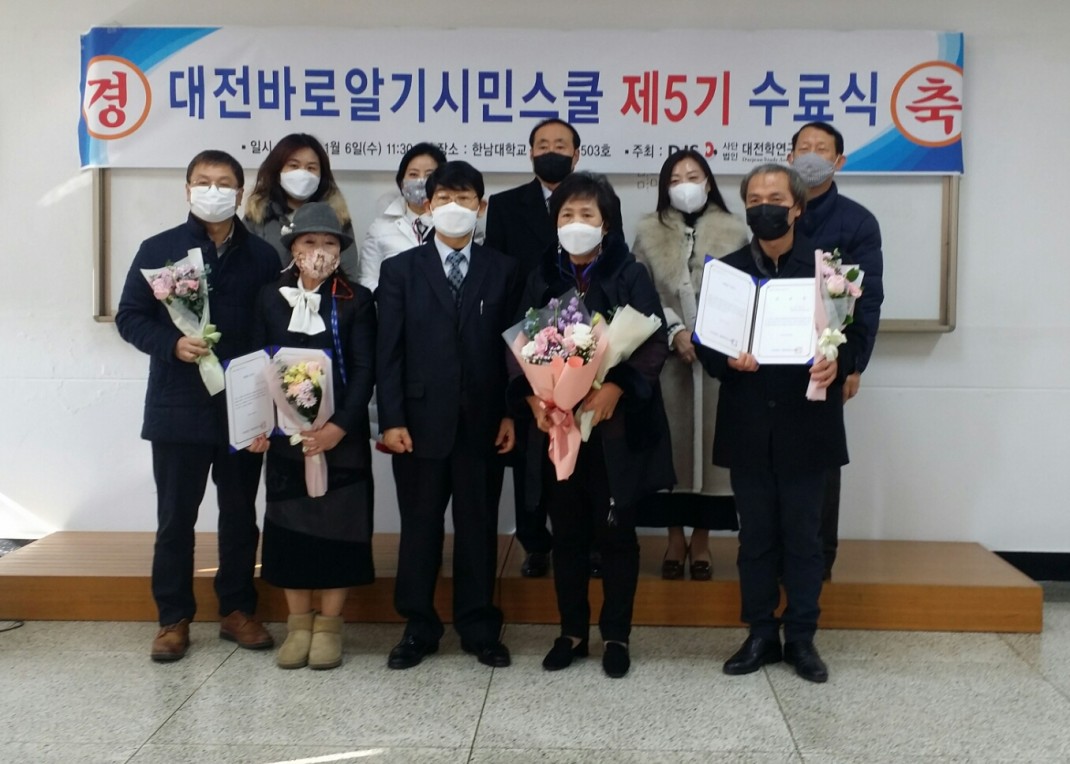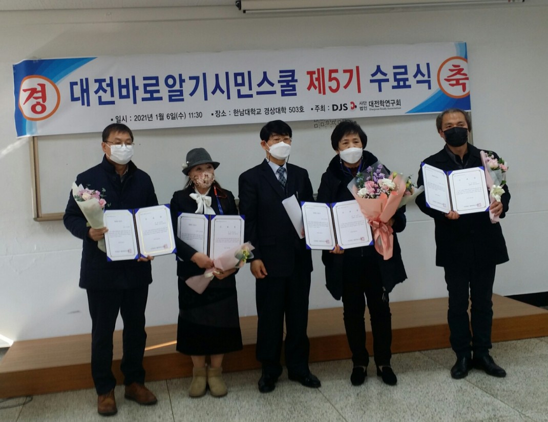 대전바로알기시민스쿨 제5기수료식 페이지 정보 작성자 관리자 댓글 0건 조회 3,537회 작성일 21-01-10 20:51 본문 대전바로알기 시민스쿨제5기 수료식이 2021년 1월6일(수요일) 11:30분 한남대학교 경상대학교 503호 강의실에서 진행되었다.코로나19라는 전례없는 어려움속에서도 대전바로알기제5기는 강의와 현장답사를 통하여대전의 특성과 정체성을 알 수 있는 좋은 시간이 되었다.이번수료식에서는 대전바로알기시민스쿨 제4기선배가 꽃다발을 준비하여 후배들을 축하하는아름다운 모습으로 훈훈함을 더하였다. 목록 답변 이전글2021년 정기이사회 및 총회개최 21.03.24 다음글대전바로알기시민스쿨 제5기 개강 20.09.24 댓글목록 댓글목록 등록된 댓글이 없습니다.