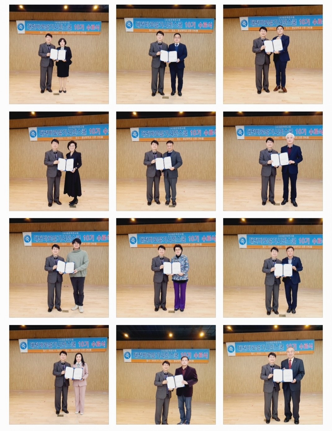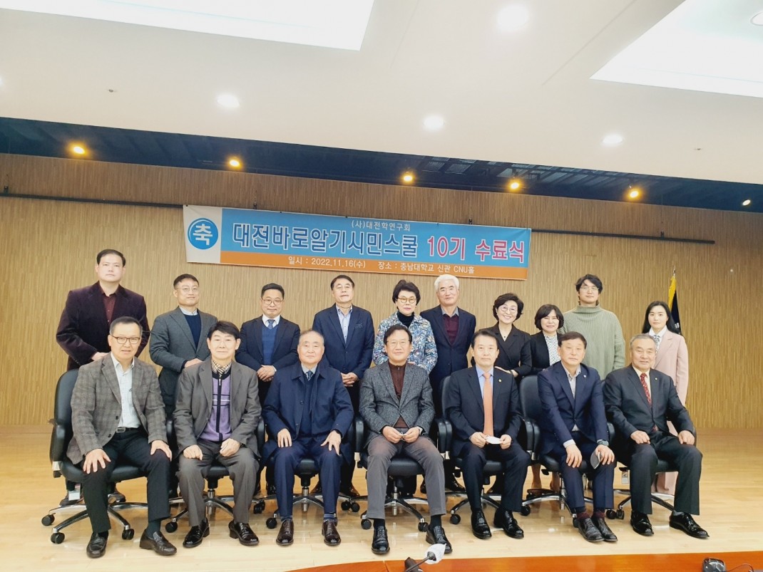 대전바로알기 시민스쿨 제10기 수료식 페이지 정보 작성자 관리자 댓글 0건 조회 3,290회 작성일 22-12-22 20:22 본문 2022년 11월 16일(수)에 충남대학교 대학본부 별관 CNU홀에서 대전바로알기시민스쿨 제10기의 수료식을 하였다. 이날 대전바로알기시민스쿨 제10기의 수료자는 총 13명으로, 수료식을 통해 수료증, 공로상, 대전학연구회 정회원 인증서, 대전시민정책개발단원 인증서 수여의 다양한 행사가 실시 되었다. 목록 답변 이전글대전학 연구회 자문위원단 회의 22.12.22 다음글대전 하늘의료 소비자생활 협동조합 업무협약 체결 22.10.24 댓글목록 댓글목록 등록된 댓글이 없습니다.