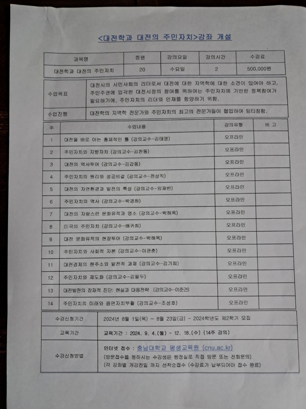 <대전학과 대전의 주민자치> 강좌 개설 / 2024.09.04.(수)~ 12.18.(수) / 14주강의
