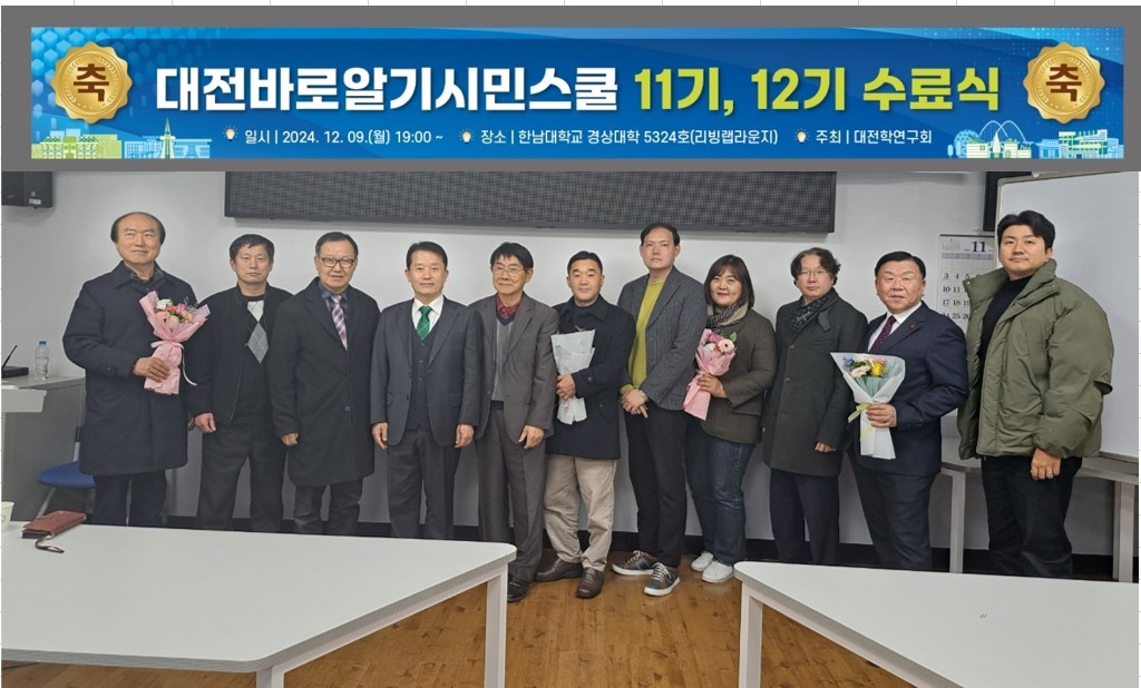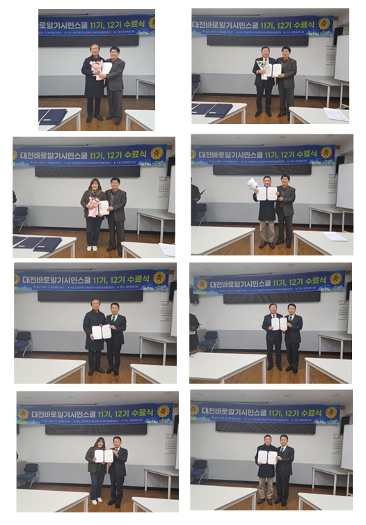 대전바로알기시민스쿨 제11기, 제12기 수료식 (2024.12.09) 페이지 정보 작성자 관리자 댓글 0건 조회 797회 작성일 25-02-10 16:35 본문 2024년 12월 09일(월)에 한남대학교 경상대학 3층 5-3-24호에서 대전바로알기시민스쿨 제11기, 제12기의 수료식을 하였습니다. 이날 대전바로알기시민스쿨 제11기, 제12기의 수료자는 총 4명으로, 수료식을 통해 수료증, 공로상, 대전학연구회 정회원 인증서, 대전시민정책개발단원 인증서 수여의 다양한 행사가 실시 되었습니다. 목록 답변 이전글공지 < 2025년 대전학연구회 정기총회 > 2025.02.24.(월) 10:00~12:00 25.02.10 다음글[ 특강공지 ] 대전바로알기 시민스쿨 특강 25.02.10 댓글목록 댓글목록 등록된 댓글이 없습니다.